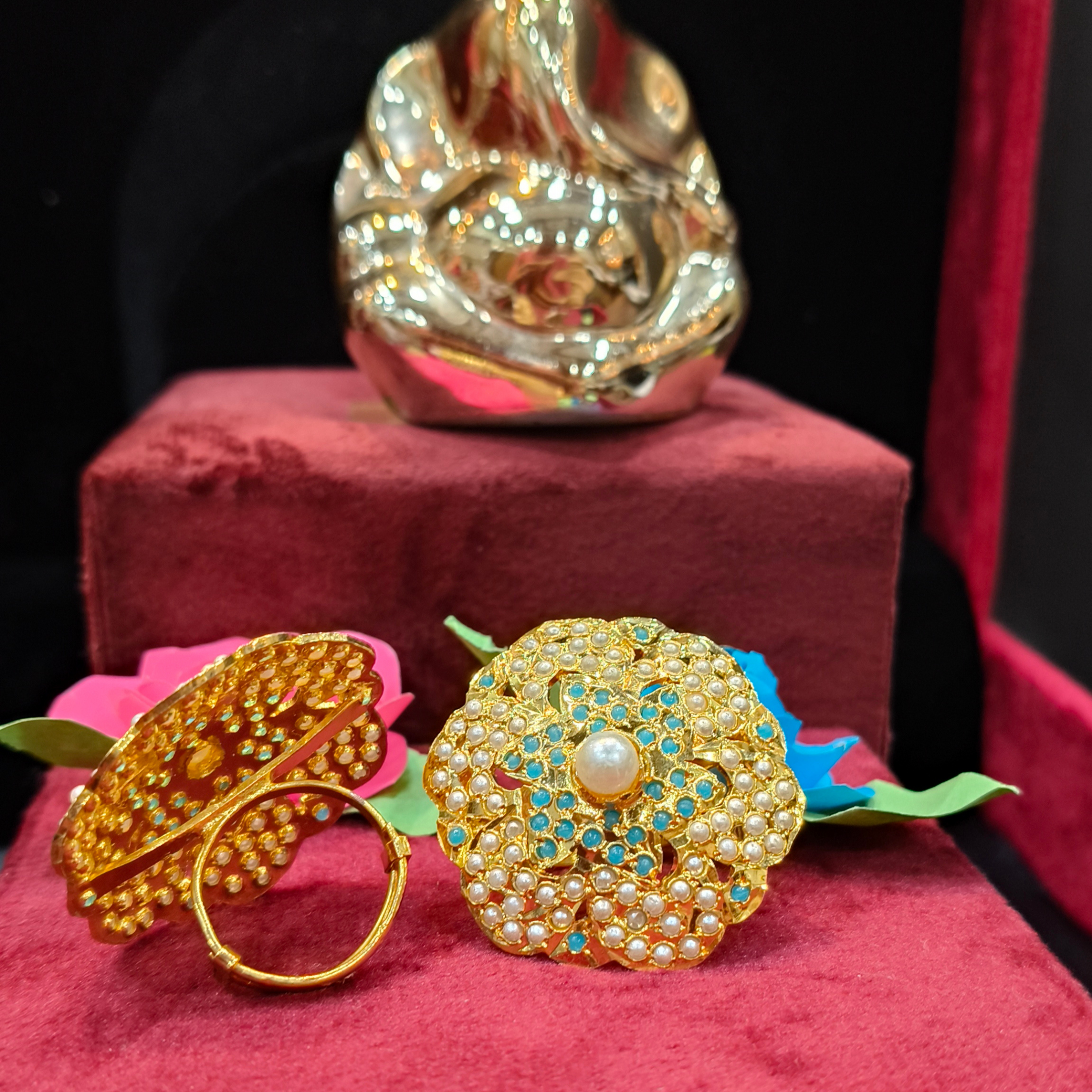 A radiant floral ring encrusted with pearls and green stones, centered with a bold pearl — elegance with a royal touch.